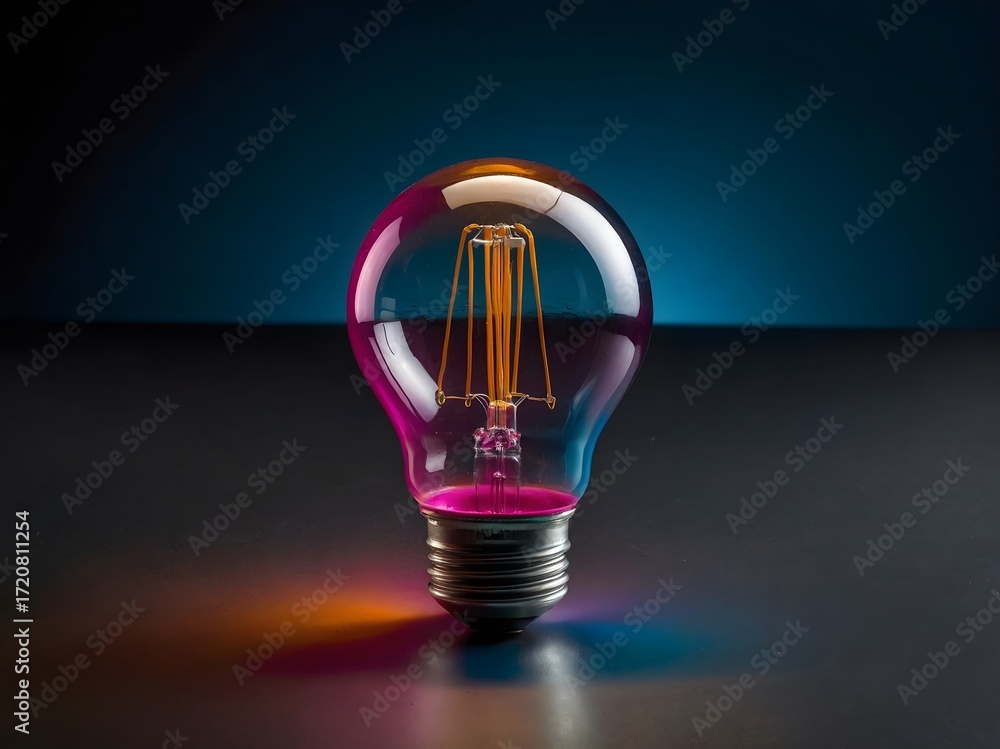 Bombilla con filamento iluminado y reflejos de color sobre fondo oscuro #1720811254