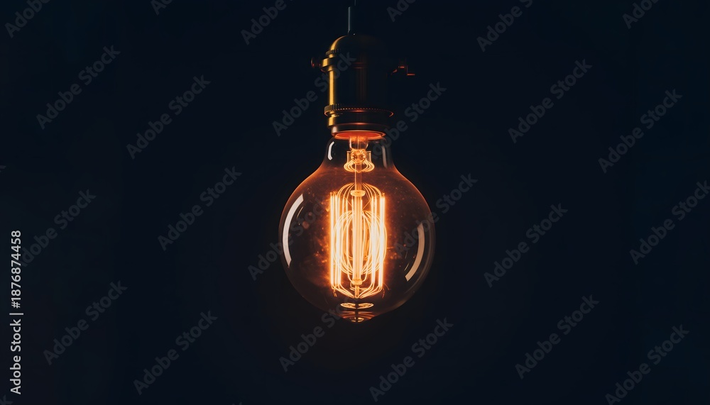 Bombilla incandescente encendida aislada sobre fondo oscuro con luz cálida minimalista #1876874458