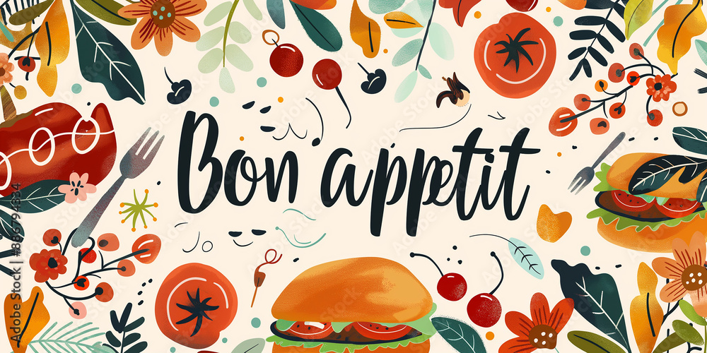 Bon appetit hand lettering surrounded by food and flowers illustration #886794334
