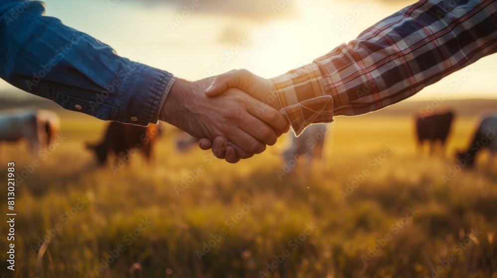 Bond between farmers and buyers as they seal a deal with a handshake amidst a picturesque scene of grazing cows #813021983