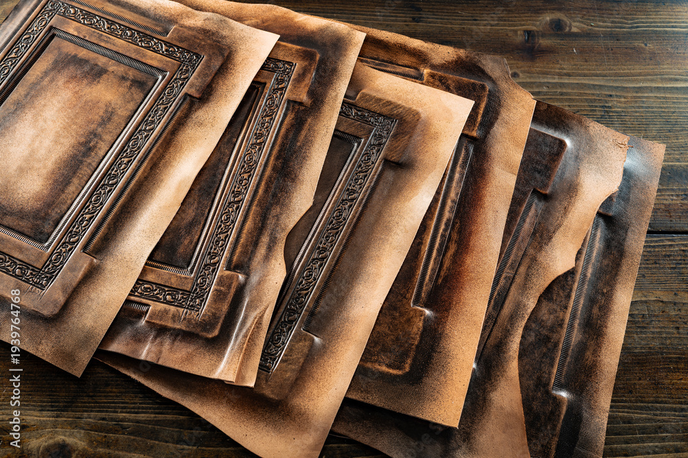 book covers in the working phase, on a wooden table #1939764768