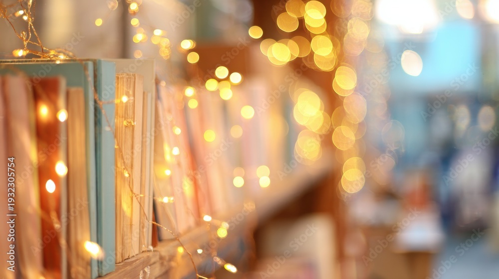 Books are lined on a shelf with lights in a cozy bookstore environment #1932305754