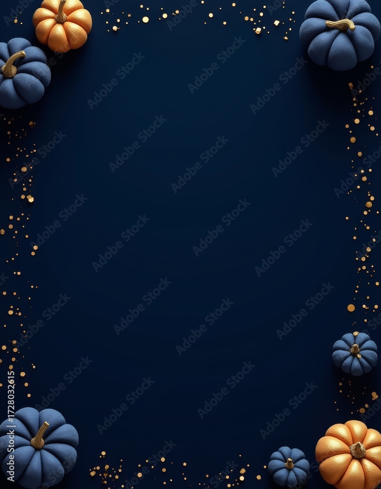 border frame with navy blue background with small gold and navy blue velvet pumpkins and golden glitter confetti on the edges minimalistic Halloween themed digital backdrop border background spooky #1728032615