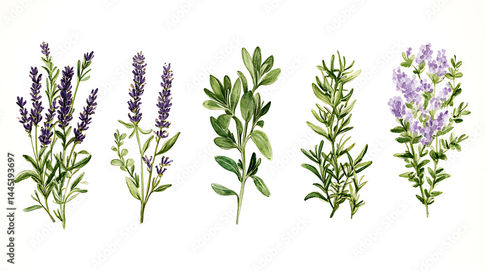Botanical herb illustrations evoke sense of nature calm beauty, displaying colorful array of herbs on clean white backdrop #1445193697