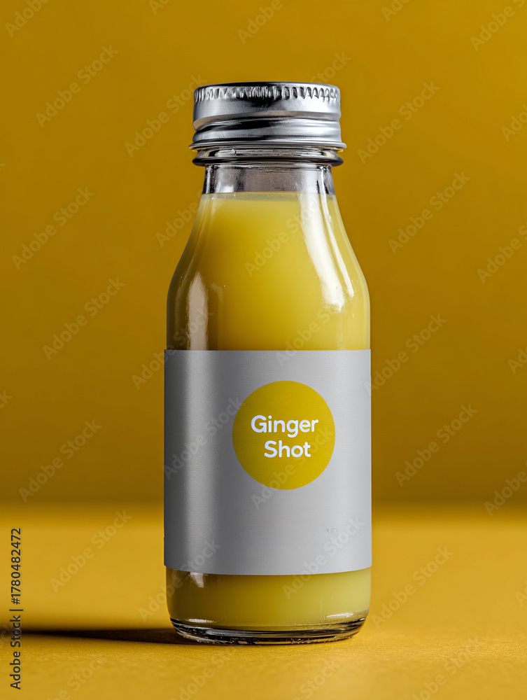Botella de vidrio con ginger shot sobre fondo amarillo, bebida saludable con etiqueta moderna y diseño minimalista #1780482472