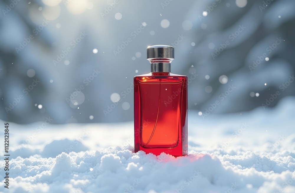 Bottle of perfume on New Year's festive snow background, against background of a Christmas tree, blurred, festive background, bokeh. Place for text, free space. #1122123845