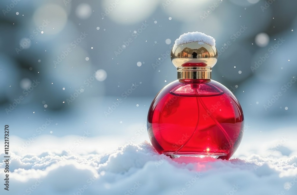 Bottle of perfume on New Year's festive snow background, against background of a Christmas tree, blurred, festive background, bokeh. Place for text, free space. #1122173270