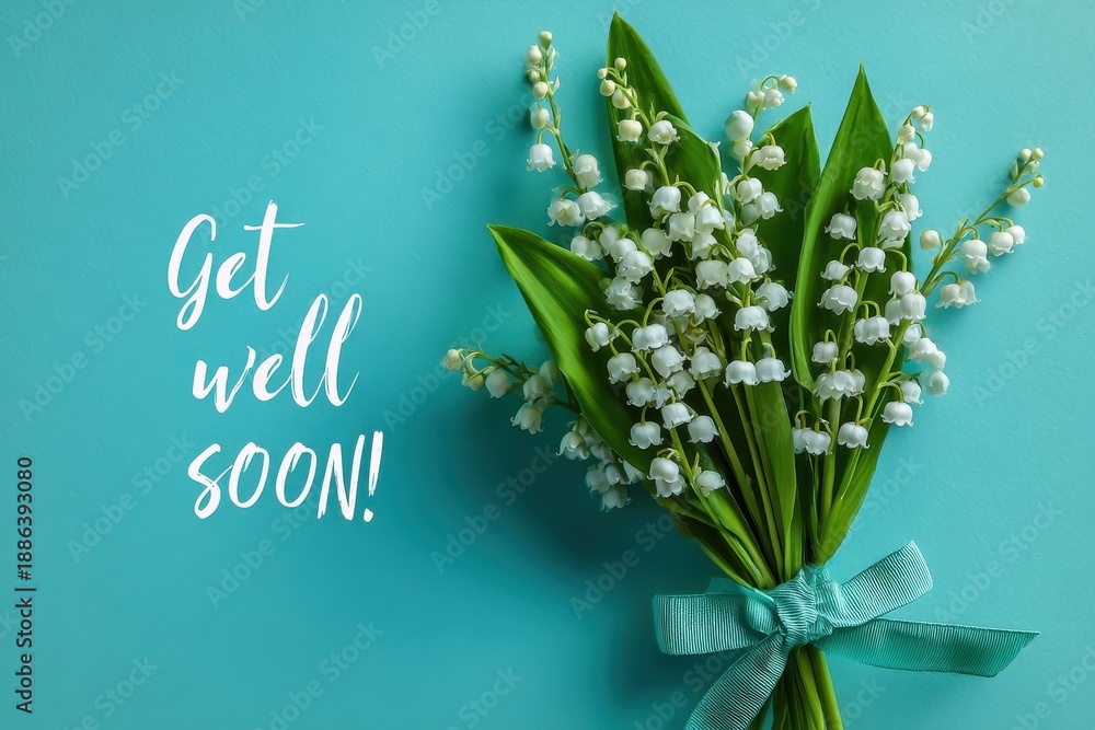 Bouquet of lily of the valley flowers with get well soon message on blue background #1886393080