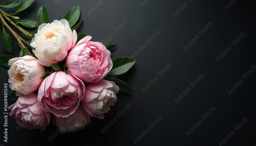 Bouquet of pink and white peonies on dark background, perfect for anniversary or celebration cards. Flat lay, moody floral composition with ample copy space for text, invites elegant design. #1669401545