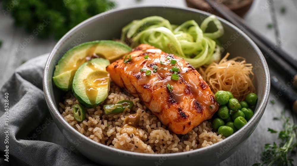 Bowl de salmón con arroz integral, aguacate y verduras estilo fitness #1970432840