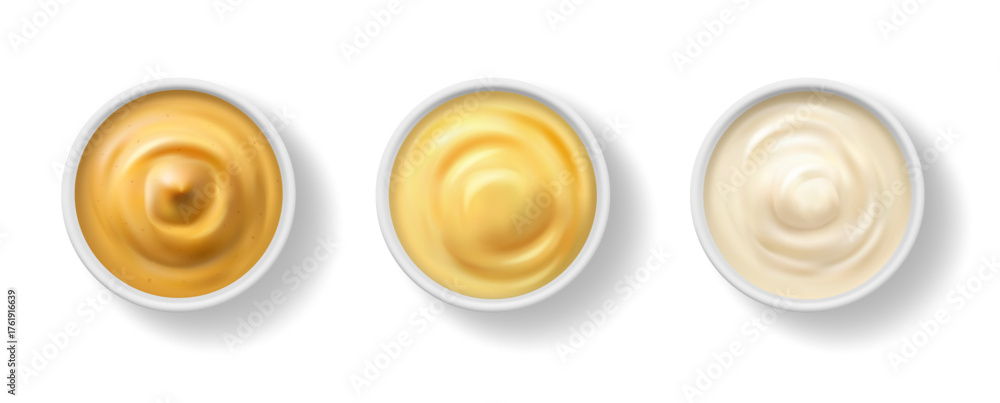 Bowls with seasonings and dip sauces for dishes and meal. Vector isolated realistic icon set of tasty mustard and garlic flavor, mayonnaise or spicy delicious dressings for salads. Snacks addition #1761916639