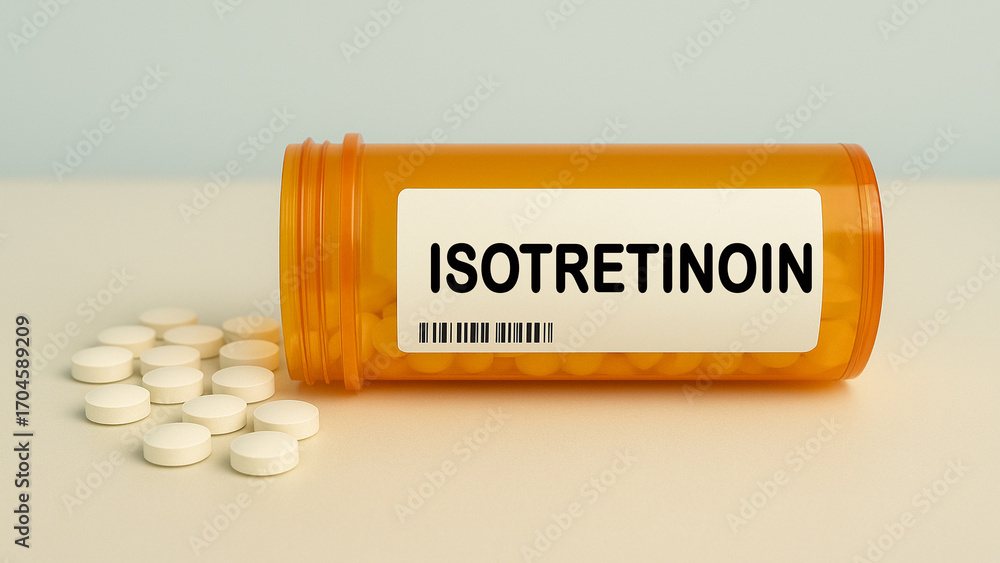 Box of ISOTRETINOIN tablets on a hospital pharmacy table used to treat severe acne a retinoid. #1704589209