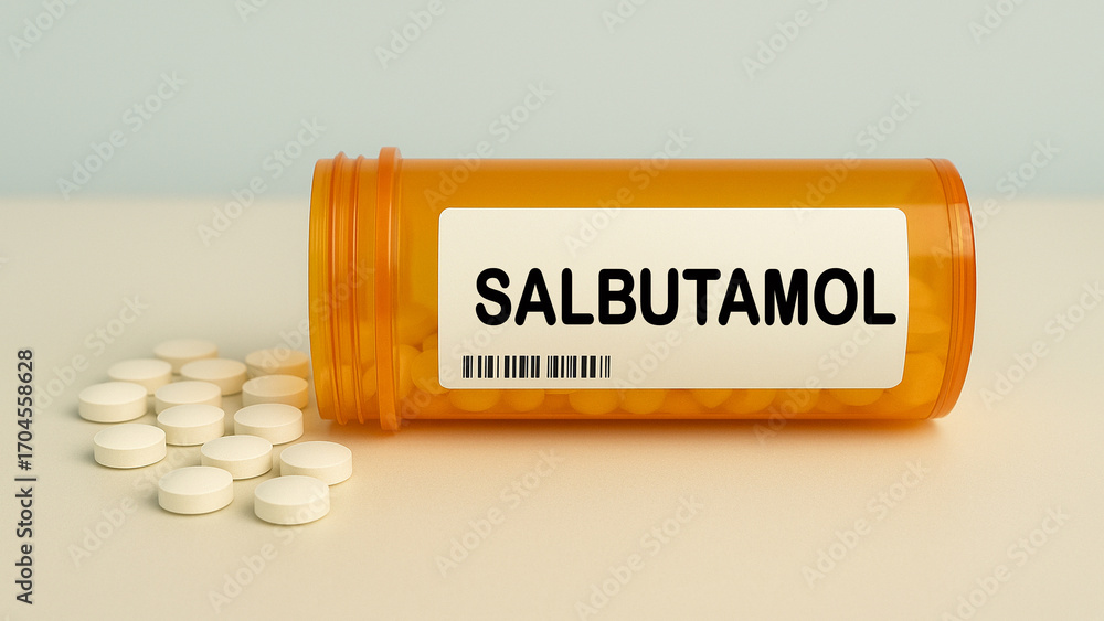 Box of SALBUTAMOL tablets on a hospital pharmacy table used to treat asthma and COPD a bronchodilator. #1704558628