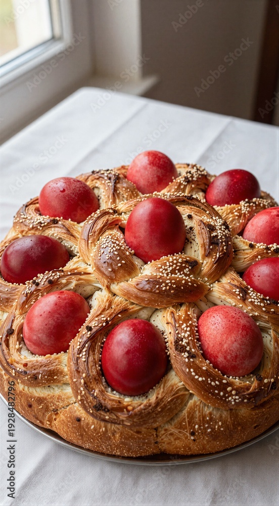 Braided easter bread topped with dyed red eggs on table #1928482796