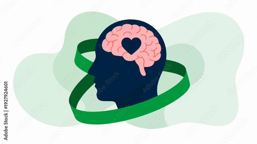 Brain with heart in profile green ribbon around head symbolizing mental health awareness and love #1927924601