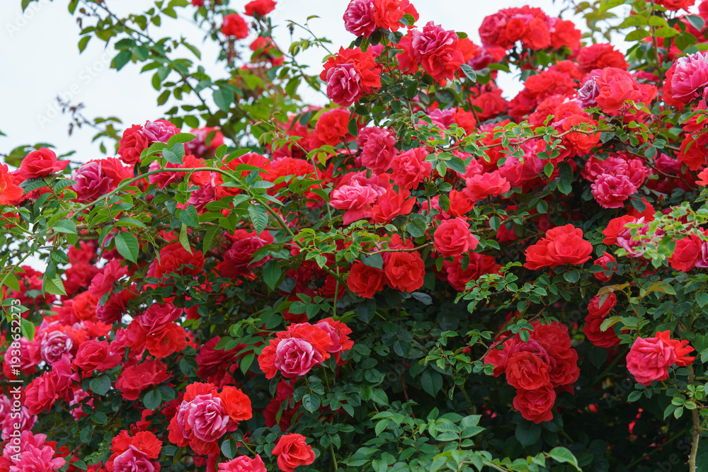 Branch of delicate red roses in full bloom growing in summer garden. Romantic floral background with natural light, decorative flowers and green foliage. Spring and nature, gardening, plant breeding. #1938652273