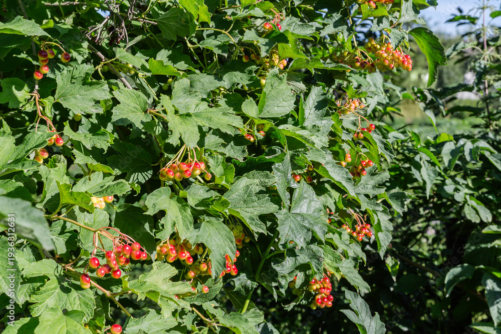 Branches of viburnum with unripe berries in sunny day #1936812631
