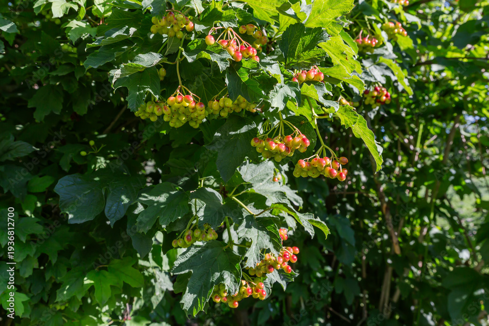 Branches of viburnum with unripe berries in sunny day #1936812700