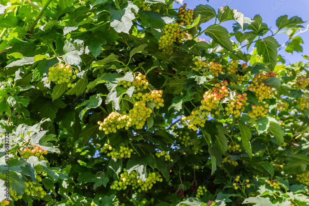Branches of viburnum with unripe berries in sunny day #1936812722