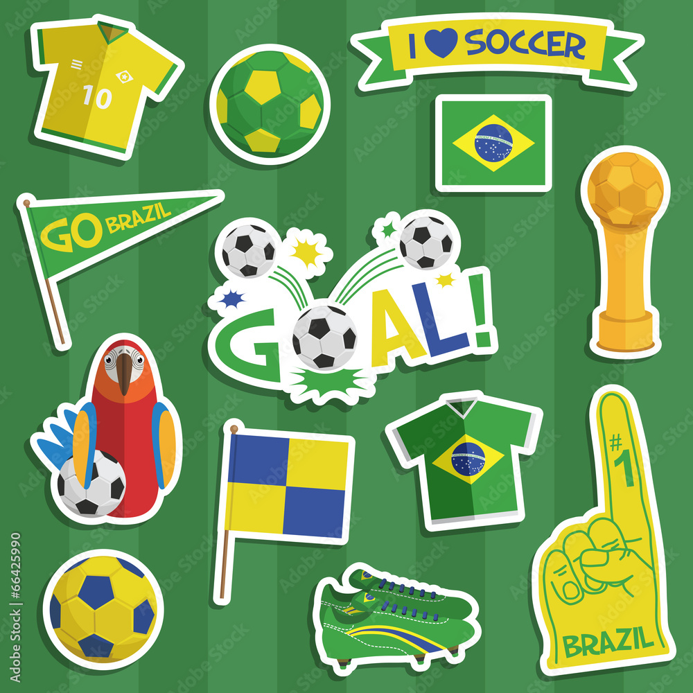 Brazil football stickers vector clipart soccer flag shirt goal ribbons on striped green background #66425990