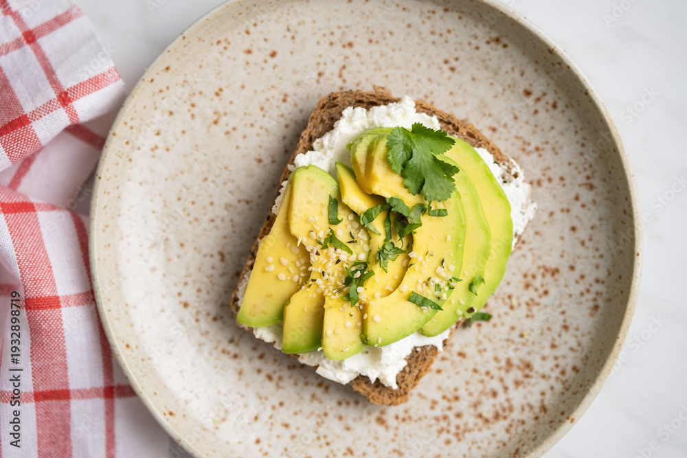 Bread toast with cream cheese and avocado. Healthy brealkfast or snack meal #1932898719