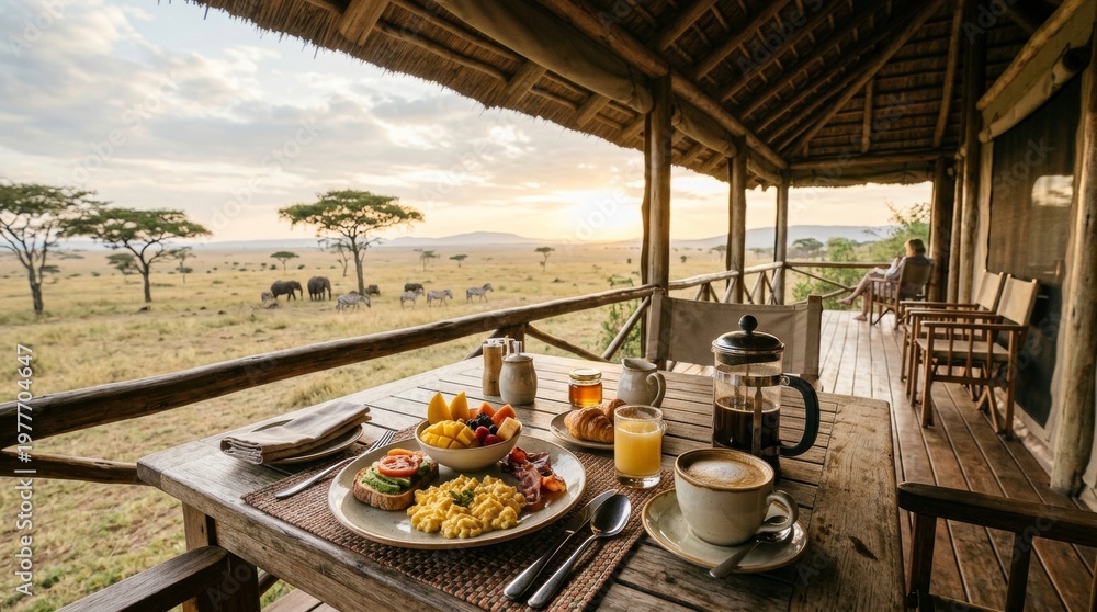 Breakfast at an African lodge surrounded by bush wilderness, offering a serene safari experience. #1977704647