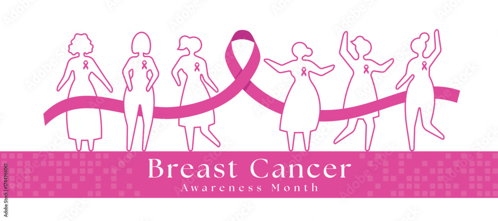 Breast cancer awareness month - Long pink ribbon awareness waving between line group of women with ribbon vector design #1744966061