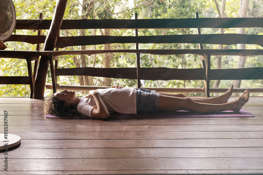 breath exercise and mindfulness, woman lying down on yoga mat, breathwork practice, self care and meditation on terrace in summer #1935397907