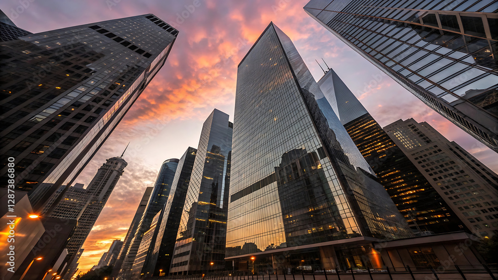 Breathtaking Modern Skyscrapers at Sunset, Capturing Stunning Reflections Across the Vibrant Downtown Skyline #1287386880