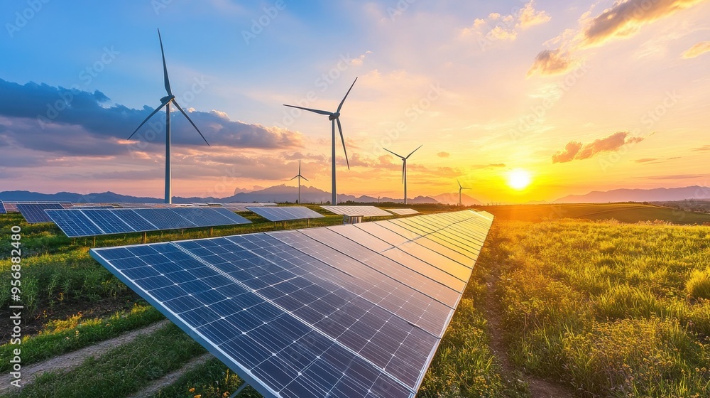 Breathtaking sunset over renewable energy sources with solar panels and wind turbines in a lush landscape. #956882480