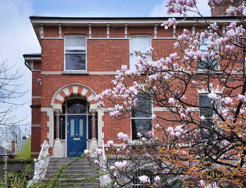 brick semi-detached houses in an older suburban residential neighborhood with magnolia tree blooming in spring #1957746954