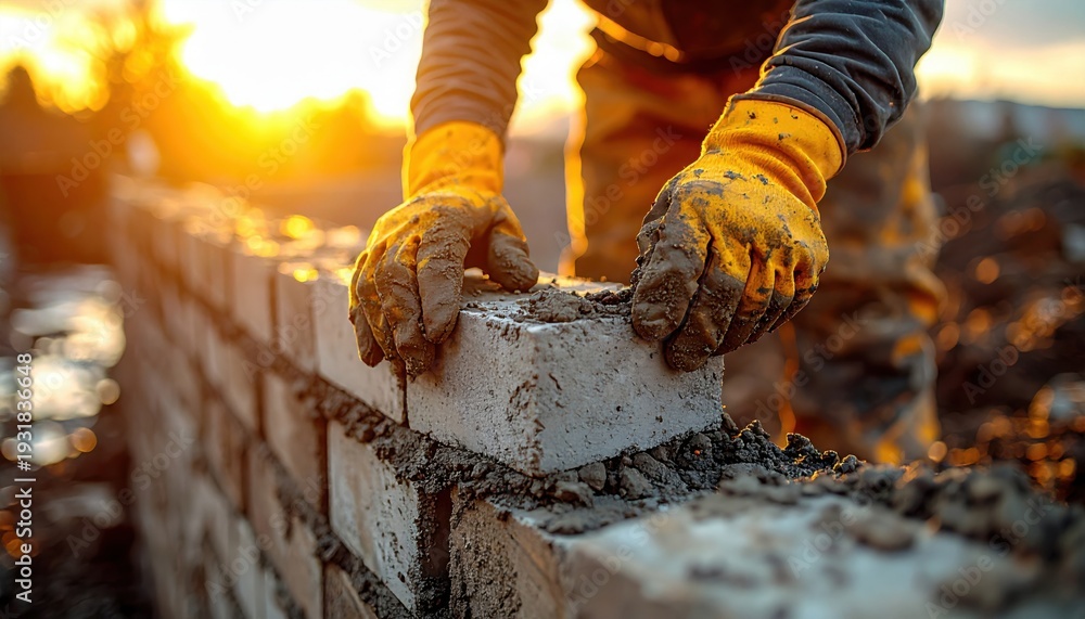 Bricklayer in yellow work gloves carefully placing a brick onto a wall with wet mortar during a golden sunset outdoors #1931836648