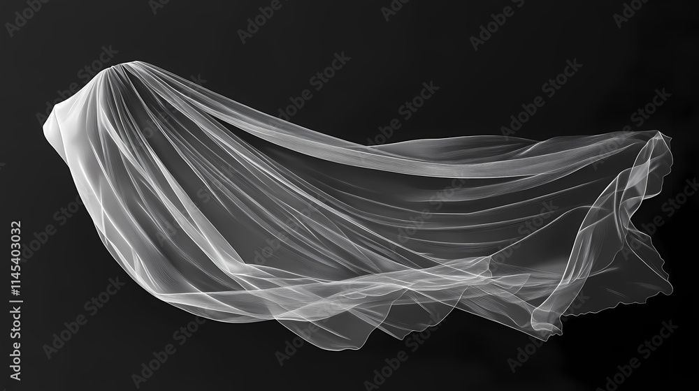 Bride's veil floating on a black background, wedding, marriage, bridal, accessory, fashion, elegance, traditional, delicate. Veil. Illustration #1145403032