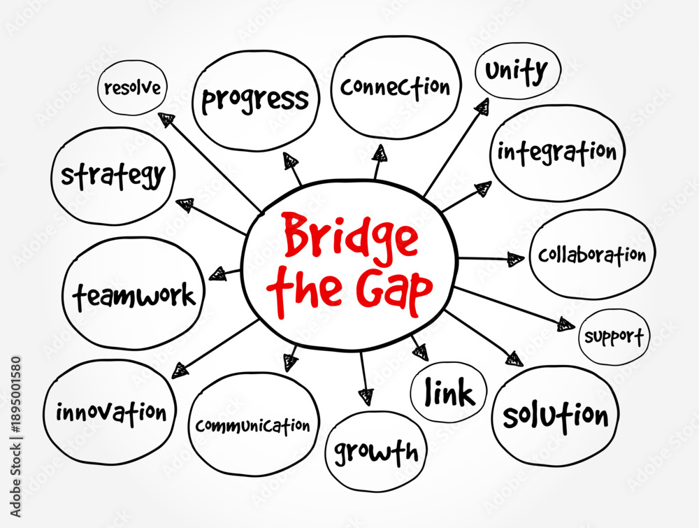 Bridge the Gap mind map diagram showcasing concepts such as teamwork, innovation, communication, growth, and solution. The chart illustrates professional connection, integration, and collaboration str #1895001580