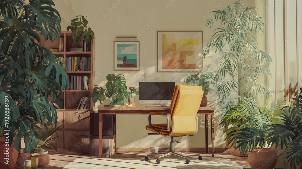 Bright and Cozy Home Office with Lush Green Plants, Desk, and Computer in Natural Light #1927636139