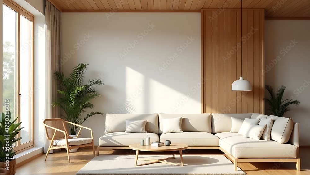 Bright and spacious modern living room interior featuring an L-shaped sofa, wooden furniture, and lush green plants, bathed in natural sunlight #1700306813
