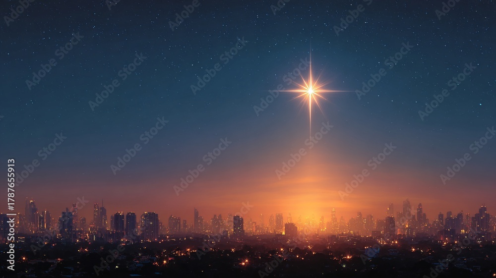 Bright Christmas christian star shining over a glowing city skyline at night. Symbol of hope, faith, and holiday spirit. Perfect for Christmas cards, nativity, and festive design themes. #1787655913
