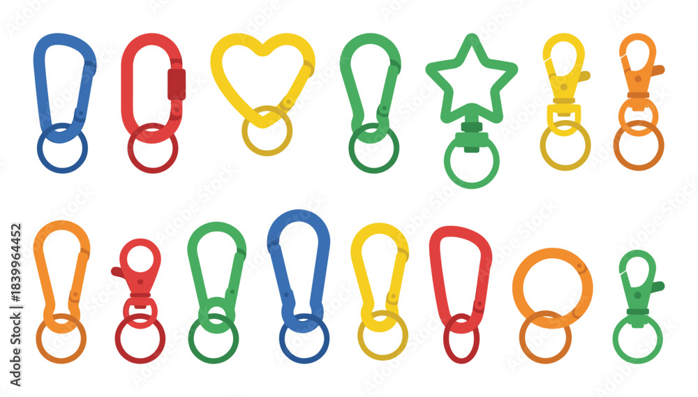 Bright colorful set of carabiners, lobster claw clasps, key rings. metal clips. various shapes. bags. #1839964452