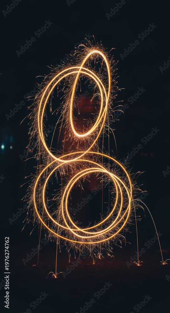 Bright golden sparklers form overlapping circular light trails against dark night background, creating festive bokeh magic and warm glowing motion #1976274762