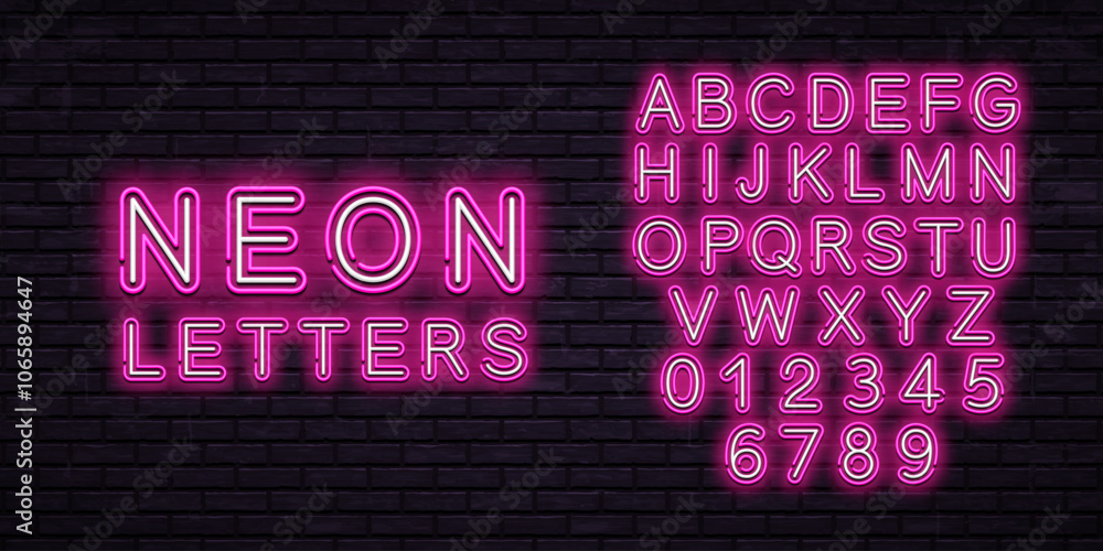 Bright neon letters isolated on dark brick wall background. Vector neon font design. #1065894647