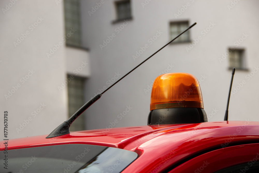 Bright orange warning light atop a red vehicle, showcasing emergency vehicle features and design elements against a blurred urban background with modern architecture #1771670703