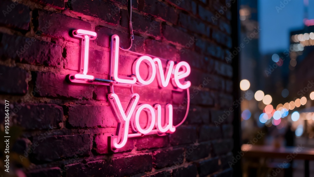 Bright pink 'I Love You' neon sign on a brick wall at night #1935364707