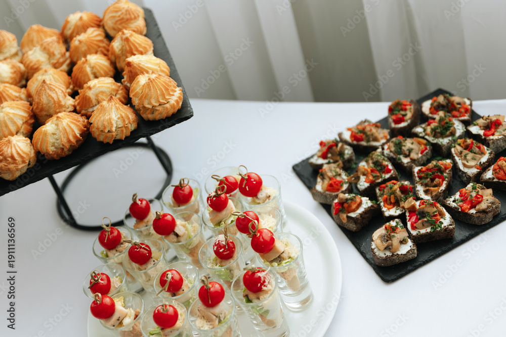 bright shot of a professional catering spread featuring three distinct types of hors d'oeuvres #1911136569