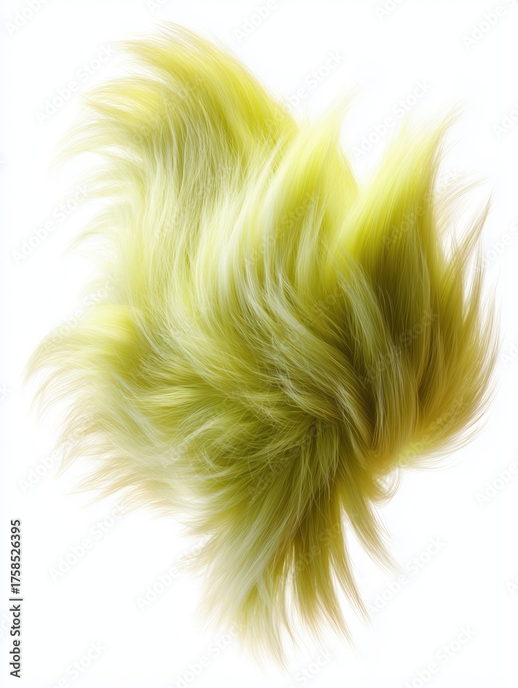 Bright yellow fluffy fur texture with long flowing strands in organic shape isolated on white background. Soft detailed macro close-up with smooth hair fibers #1758526395