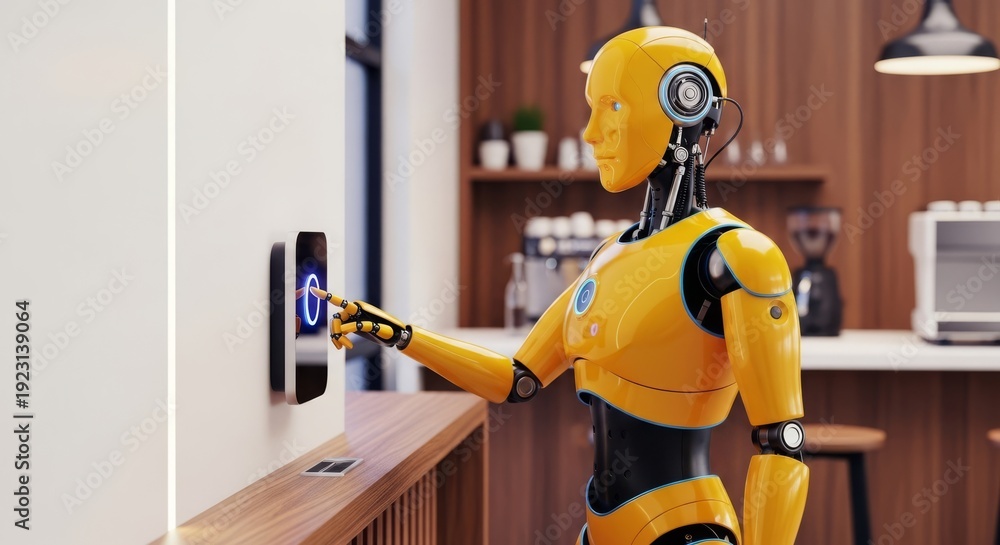 Bright yellow humanoid robot activates a device by pressing a button within a sleek, modern coffee shop with warm wooden aesthetics, contemporary, control, business #1923139064