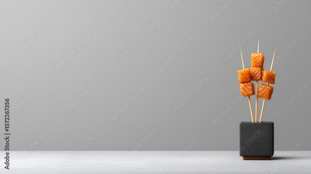 Brightly arranged candied salmon cubes on skewers create an eye- #1572267356