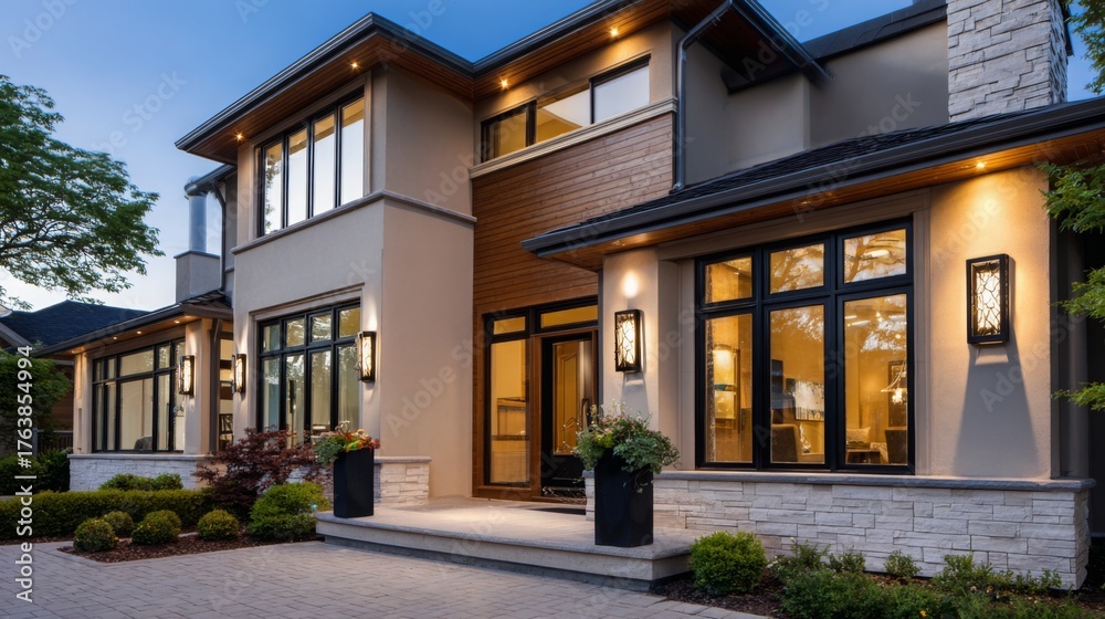 Brightly lit modern home exterior with elegant landscaping during twilight hours #1763854994