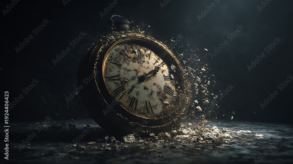 broken antique clock floating in zero gravity, dust illuminated by soft light, feeling of frozen time and solitude, fine art realism, poetic dark tone, #1924406423