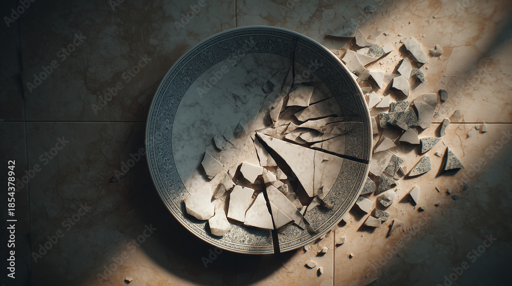Broken ceramic plate shattered on the floor with scattered fragments, accident concept showing household damage, mess and cleanup aftermath on kitchen tile. #1854378942