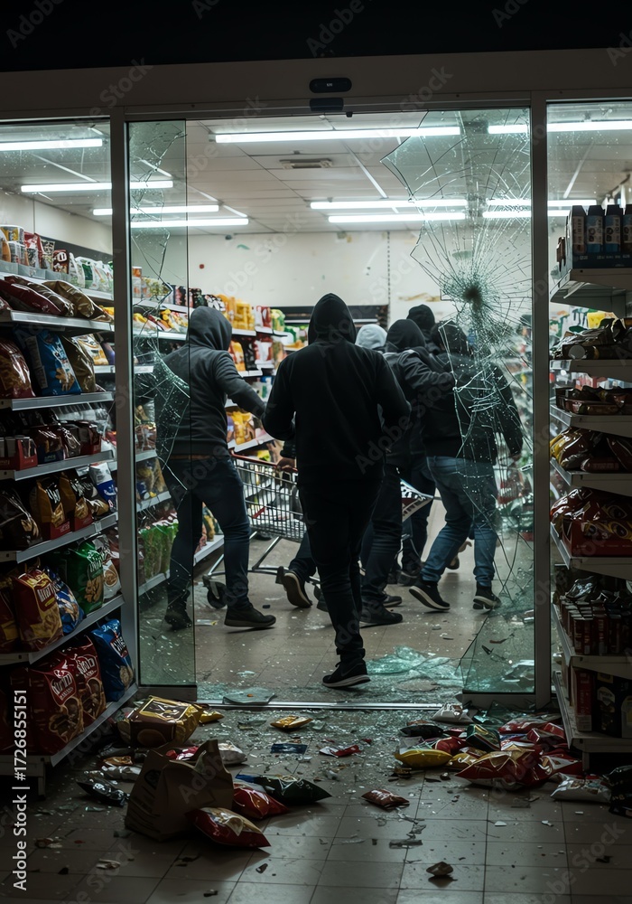 Broken Glass Door with Group of Masked Individuals Looting Grocery Store During Night #1726855151